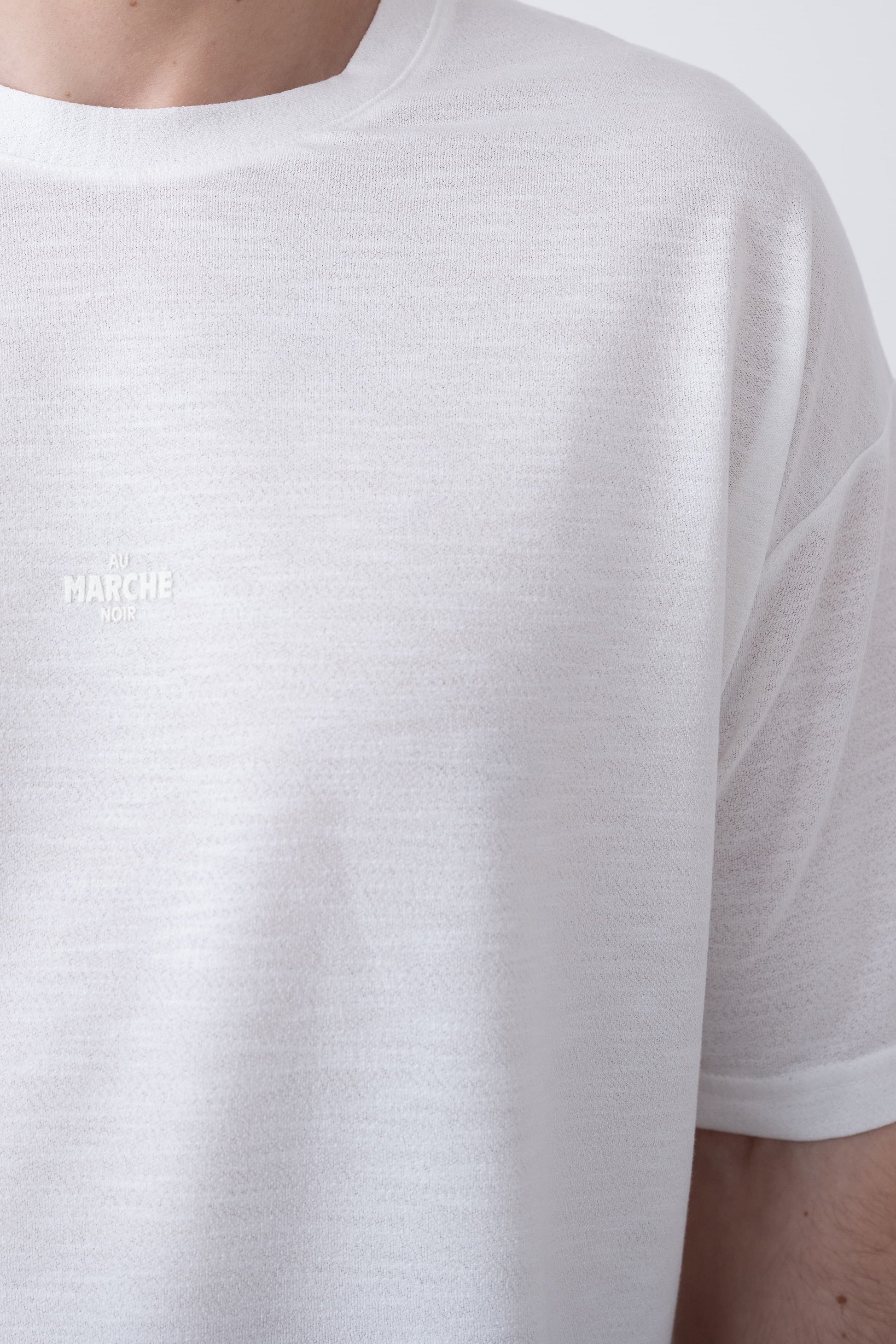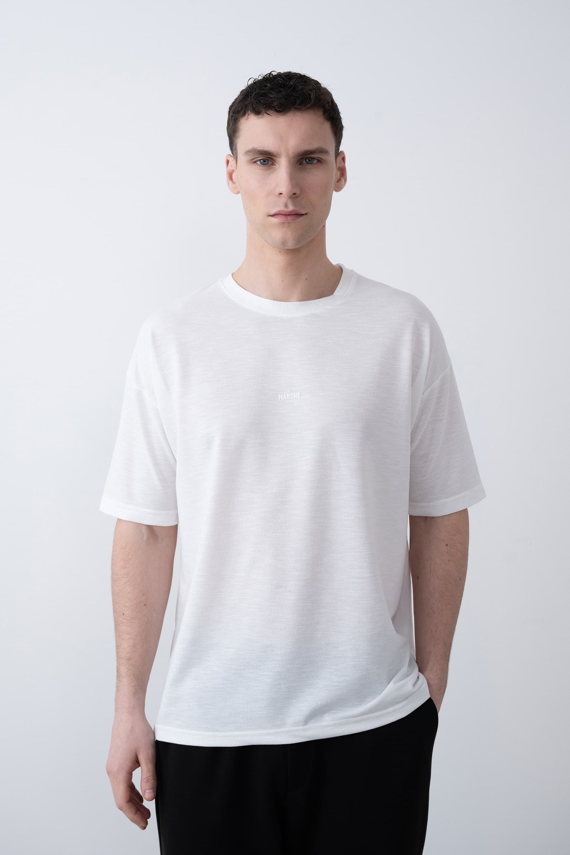 Arka kısmının sade tasarımı, t-shirtü daha minimalist bir parça haline getirirken, "AU MARCHÉ NOIR" yazısı t-shirtün şıklığını öne çıkarır. Ürünün şık, sade ve zarif duruşu, rahatlıkla kombinlenebilir ve her tarza uyum sağlar.